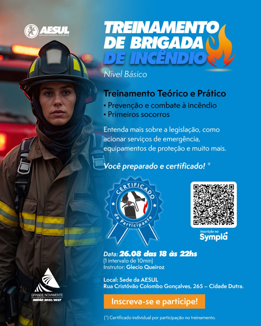 🔗 Inscreva-se: https://www.sympla.com.br/evento/treinamento-de-brigada-de-incendio-e-primeiros-socorros---aesul/3065735