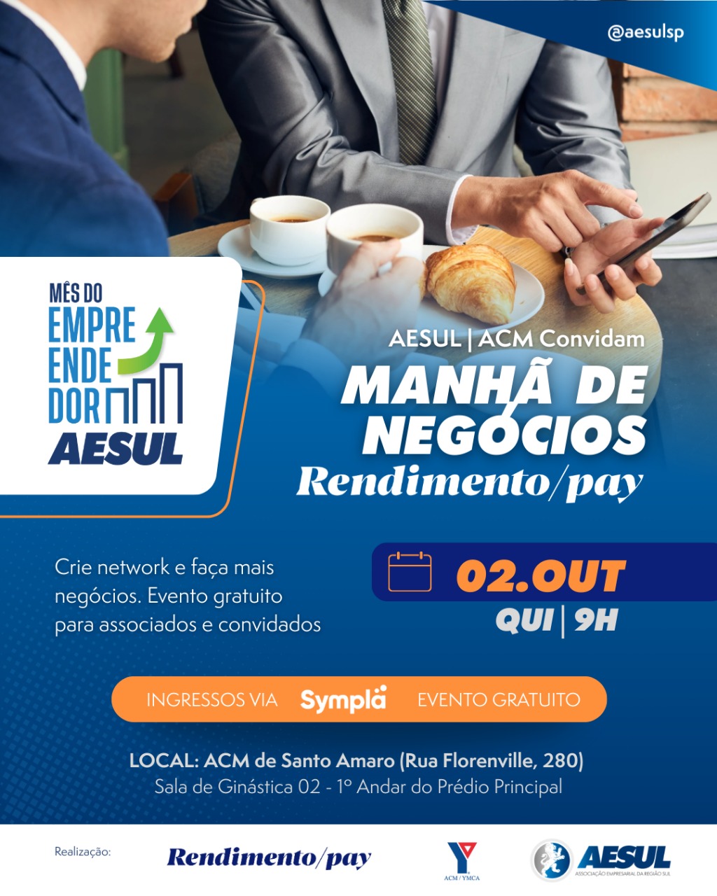 A AESUL e a ACM te convidam para o MANHÃ DE NEGÓCIOS RENDIMENTO/PAY — uma manhã de conexões reais, oportunidades incríveis e muito networking no Mês do Empreendedor AESUL.