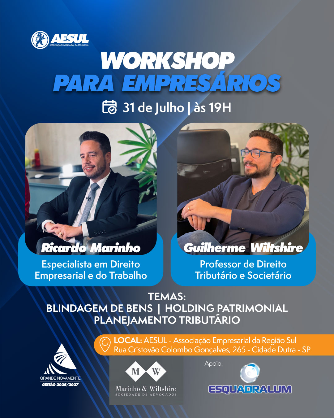 A AESUL convida você para um workshop exclusivo voltado a empresários que querem fortalecer suas estratégias de proteção patrimonial e organização societária.